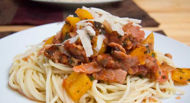 10. Shave parmesan or mature cheddar cheese over the top to taste. If your looking to impress, you might want to place the shavings artfully on top of the bacon and basil spaghetti sauce.