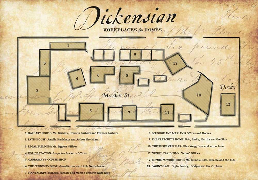 The plot is centred around Market Street, in the heart of Victorian London, where the lives of characters from Dickens’ novels are brought together for our grim amusement. Scrooge and Jacob Marley’s office sits next to the The Old Curiosity Shop, with Bumble’s workhouse just around the corner and Fagin’s Lair tucked away in the shadows by the dock.