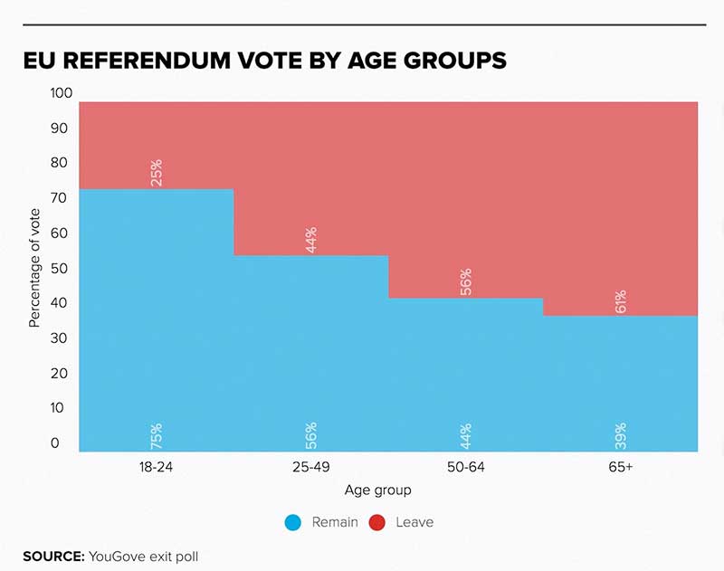 You can see the figures in full below, and it paints a very clear picture that it was very much the older age groups that swung the balance in favour of the leave vote with the 65+ bracket being the worst offenders. 61% of them voted to leave the EU and another 56% of 50-64-year-olds voting for the same result, sparking the exit, economic instability and potential breakup of the United Kingdom as a result.