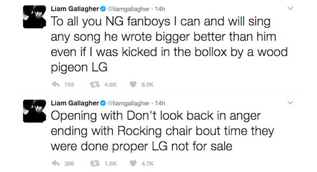 There’s a hater and Noel Gallagher fan boy theme to a fair few of Liam’s Tweets of late, so clearly the first is a continuation of that into his song writing. The second sounds like it could easily fit into the lyrics for Not For Sale, but we’ll have to wait for the single’s release to find out. We haven’t had anything knew from the former Oasis front-man since Beady Eye’s Different Gear, Still Speeding, so it’s going to be interesting to see how the new single lands. You can follow the latest from the saga with Liam Gallagher’s Twitter page. From the look of Noel Gallagher’s Twitter page, it doesn’t look like he’s biting back yet, so we probably won’t be getting a slanging match, sadly.