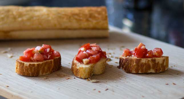 - Start by chopping your tomatoes into teeny tiny chunks and set aside in a bowl. We tend to slice a tomato as though you’re planning to make a sandwich and then dice the slices into little chunks that will be easy to when it comes to spooning them out