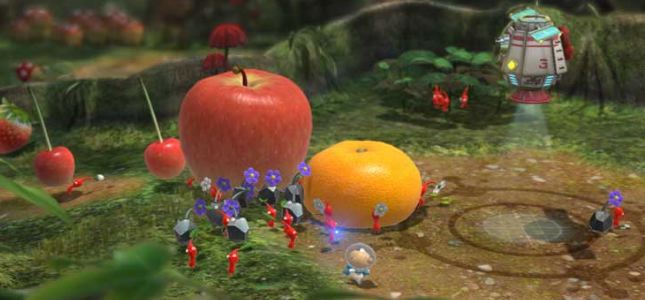 When you start the game, you’re eased into the concept of the strategy based gameplay through a tutorial process in which the ship explains new things and abilities that you discover. The overarching game concept sees you take in the help of the varying sub-species of Pikmin to progress through the story. You can call them to your side, hurl them into battle with the planet’s big mean nasties, get them to take care of constructing bridges or taring down barriers to make it through the levels, collect flower pellets and dead monster carcasses to increase their numbers and pick up the planet’s supersized fruit to keep you in stock of life giving juice.