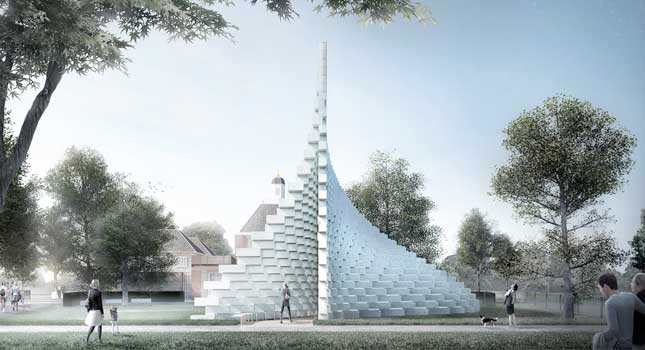 Bjark Ingels’ Pavilion is pictured above with its white, stepped peak and slender-line frame made out of fibreglass bricks, stacked and affixed with both straight line and wave form contours. It’s described as an unzipped wall and takes the architect team back to the very basics of construction with the brick wall. However, it’s far from basic in its design, looking like a very post-modern deconstructed reconstruction of a wall that’s in a state of flux between solidity and fluidity.