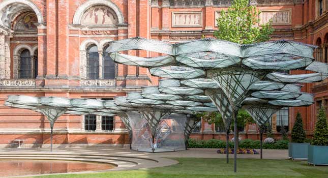 It’s a part of the Victoria And Albert Museum’s Engineering Season and has apparently been designed to take a cheeky look at the impact of ongoing developments in robotics on architecture, technology and the process of manufacturing and construction. It’s the work of a team of crack architects and engineers from the University Of Stuttgart in a case of large scale biomimicry that draws its inspiration from elytra, the forewing shells of flying beetles.