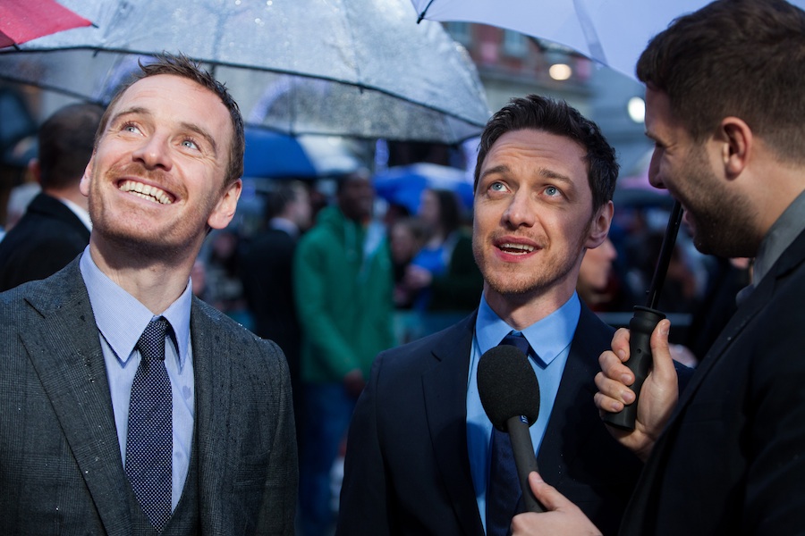 Michael Fassbender and James McAvoy get a bit drenched under the rainy London sky of Leicester Square.